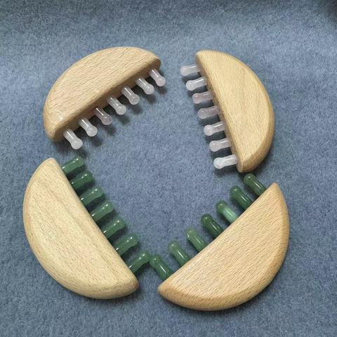 Tendência Custom Logo Scalp Massager Ferramenta Guasha de madeira com Jade Stone Gua Sha Massagem Pente Massagem corporal para Face Lift Área dos olhos